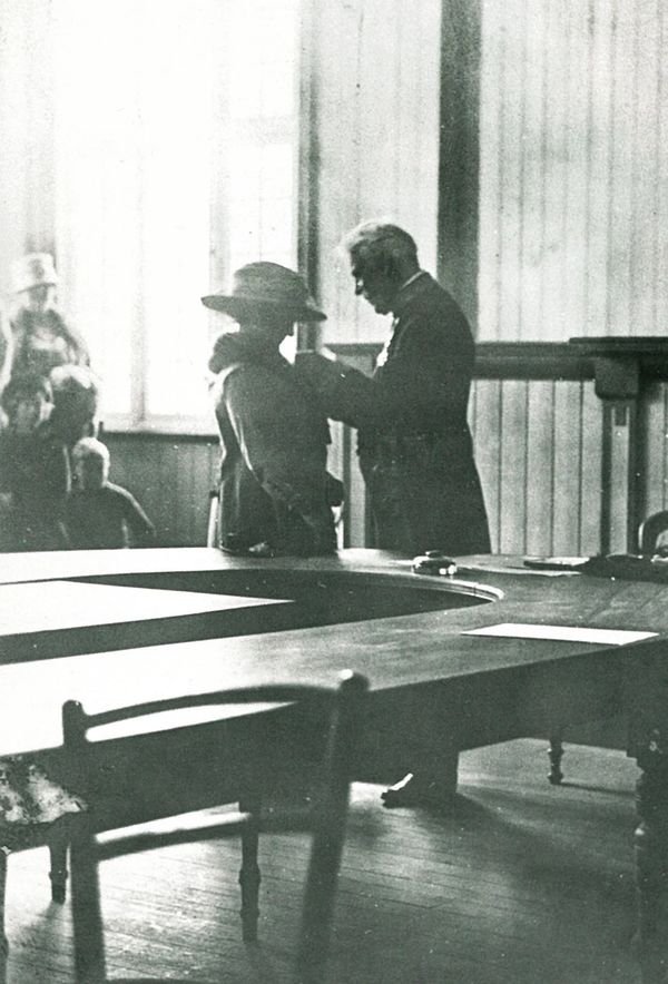 The Lords Commissioners of the Admiralty presented Christina and Marion with a silver teapot while Mrs. Felton was awarded an OBE for notifying the fleet - the first OBE awarded to a Falkland Islander.